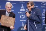 Ousted President Graham Spanier, left, presents head football coach Joe Paterno with a plague commemorating his 409th win